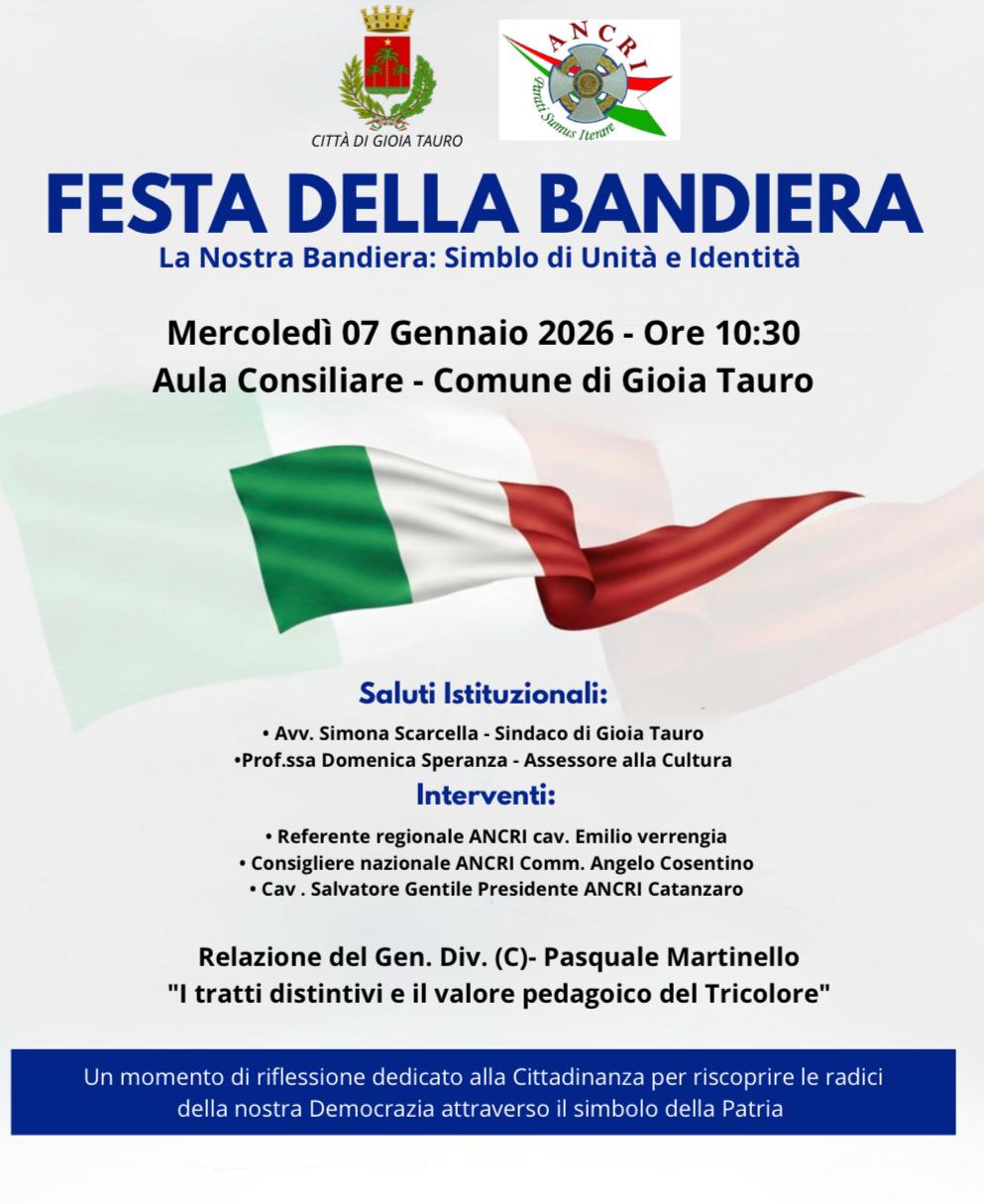 Festa della Bandiera La nostra Bandiera: Simbolo di unità e identità Mercoledi 07 Gennaio 2026 - Ore 10:30 Aula Consiliare Comune di Gioia Tauro