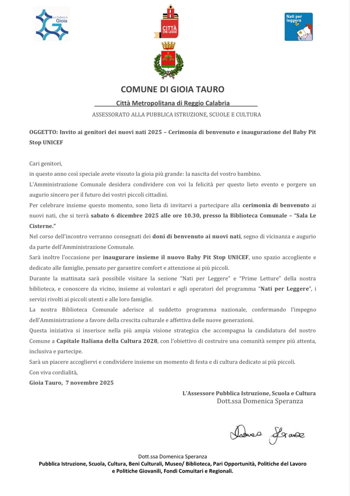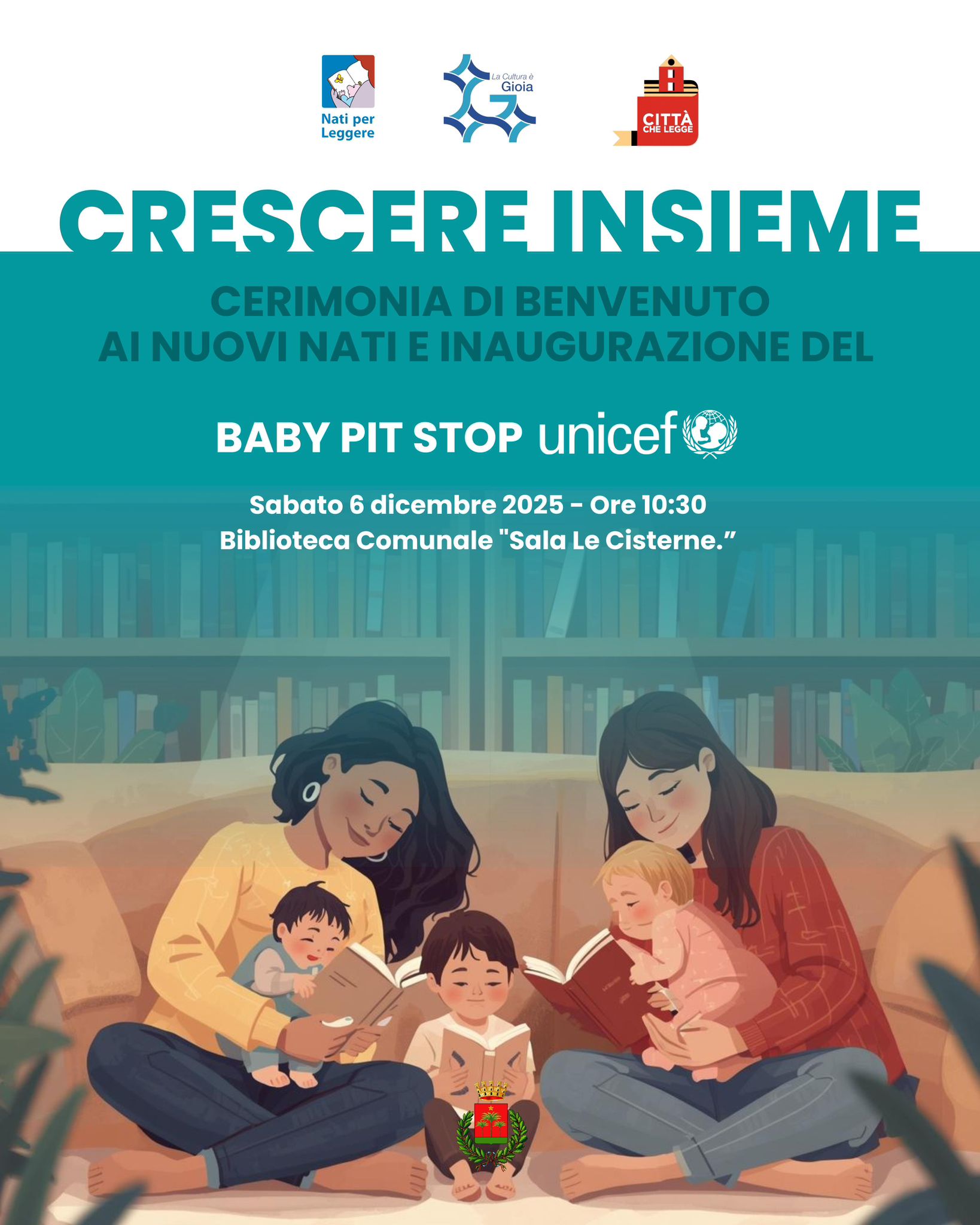 Invito ai genitori dei nuovi nati 2025 - Cerimonia di benvenuto e inagurazione del Baby Pit Stop UNICEF - sabato 6 dicembre 2025 alle ore 10:30 Presso la Biblioteca Comunale " Sala Le Cisterne"